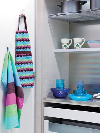 廚房里,最常見的柜門,可以在內部安裝小掛鉤或者子母貼,將圍裙、毛巾之類的輕巧物件懸掛或粘貼其中,不僅美觀地解決了問題,其“隱身術”更是讓廚房變得新奇而實用。